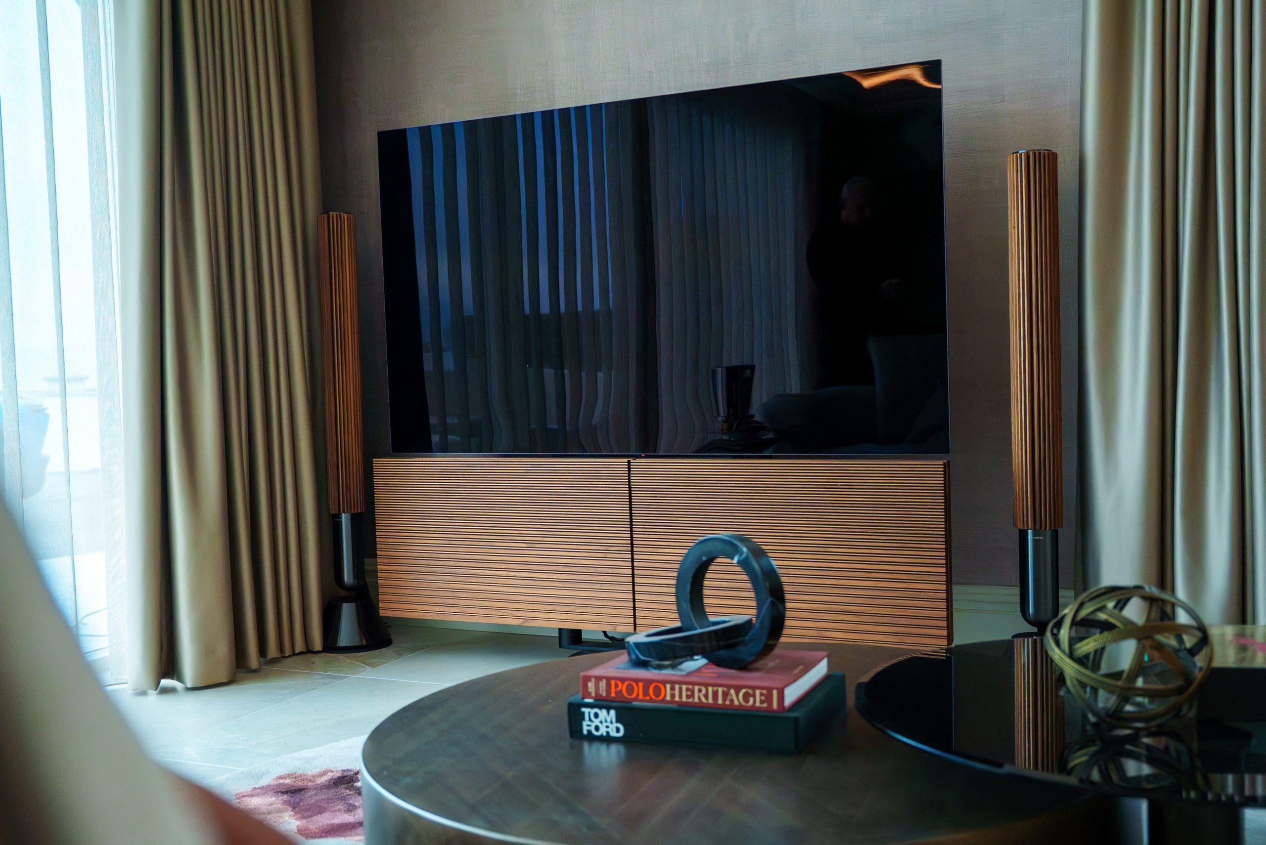 • Installed a custom-finished BeoVision Harmony TV in a stunning bronze tone — a true statement piece. When powered on, the sculptural speaker panels unfold dramatically to “start the show.”