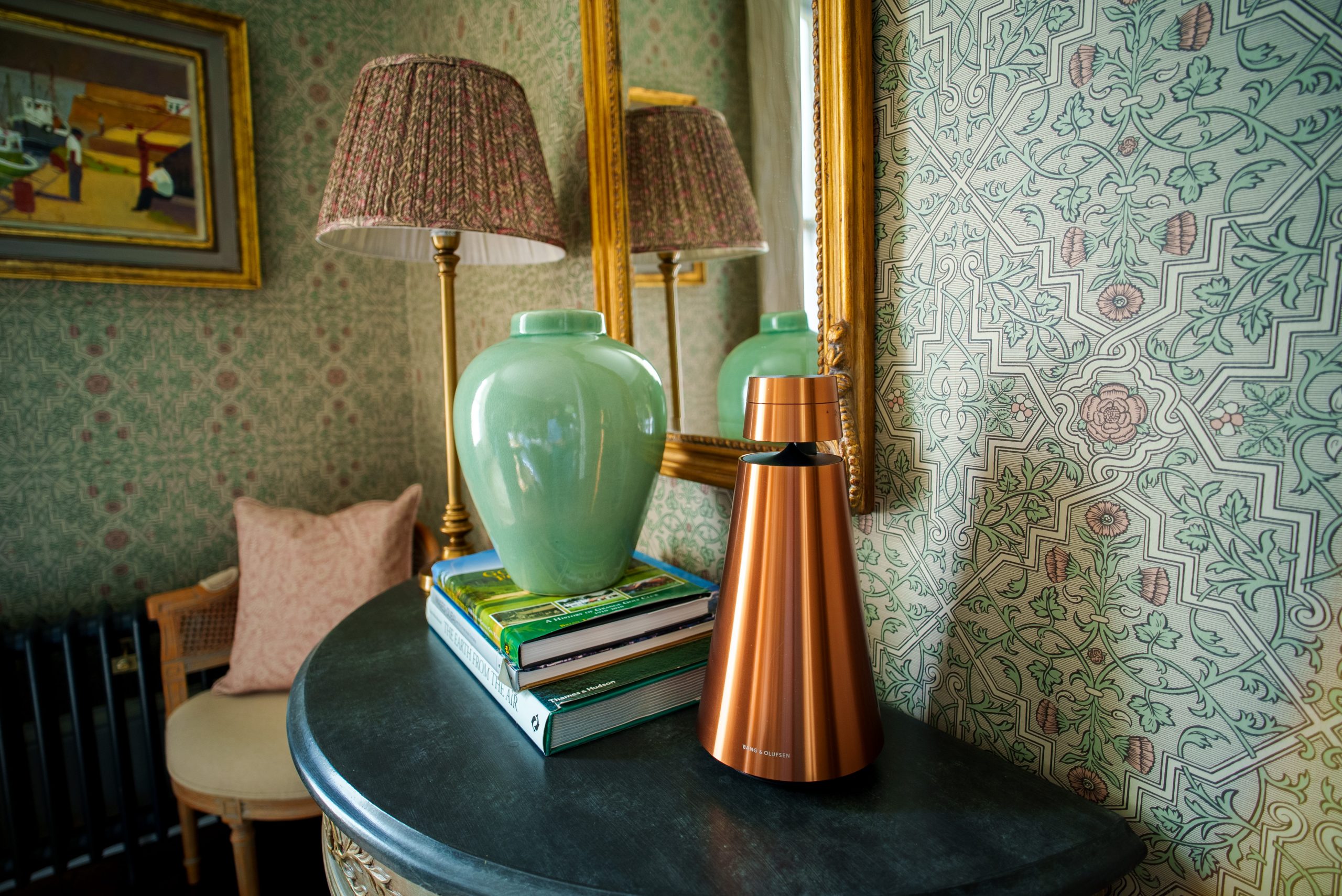 A BeoSound 2 speaker in bronze tone provides ambient music, perfectly suited to the atmosphere of the drawing room.
