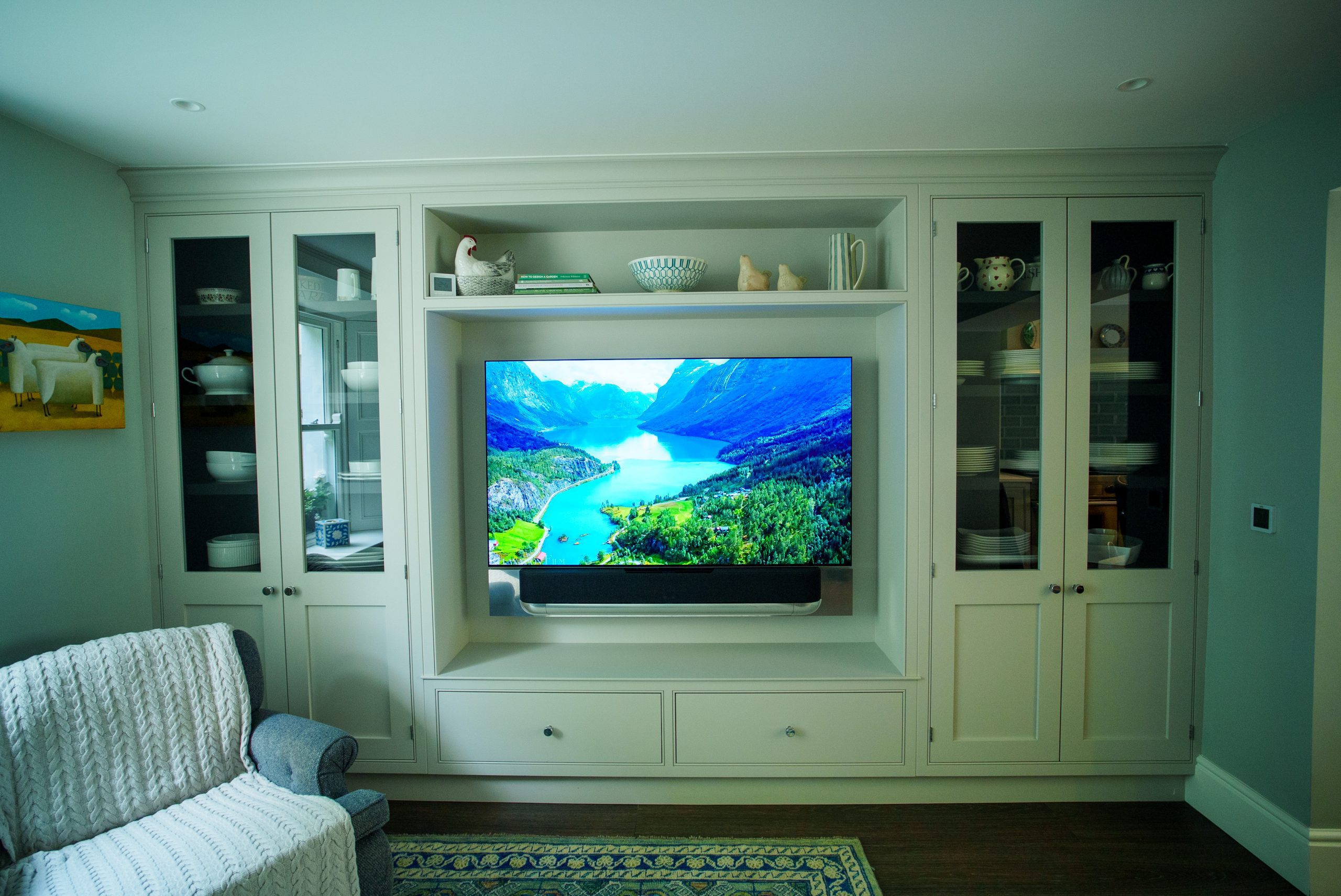 A BeoVision Theatre 65” is recessed into the cabinetry beside the kitchen — perfect for finishing a meal and relaxing to watch TV. - Main Living Room with Bar